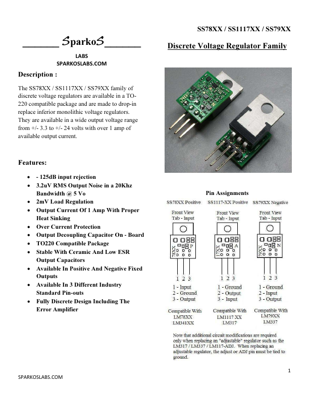Sparkos Labs SS78XX, SS1117XX and SS79XX Discrete Voltage Regulator Family