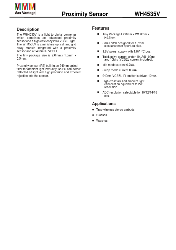 The WH4535V is a light to digital converter which bines an advanced proximity sensor and a high efficiency infra VCSEL light. The WH4535V is a miniature optical land grid array module integrated with a proximity sensor and a 940nm IR VCSEL. The tiny package size is 2.0mm x 1.0mm x 0.5mm.