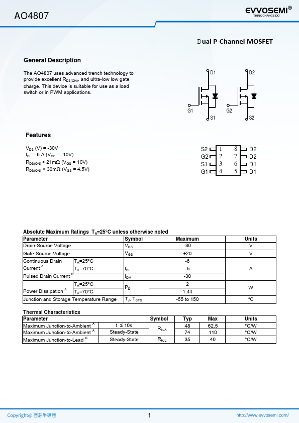 The AO4807 uses advanced trench technology to provide excellent RDS(ON), and ultra-low low gate charge.