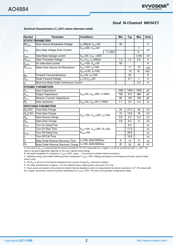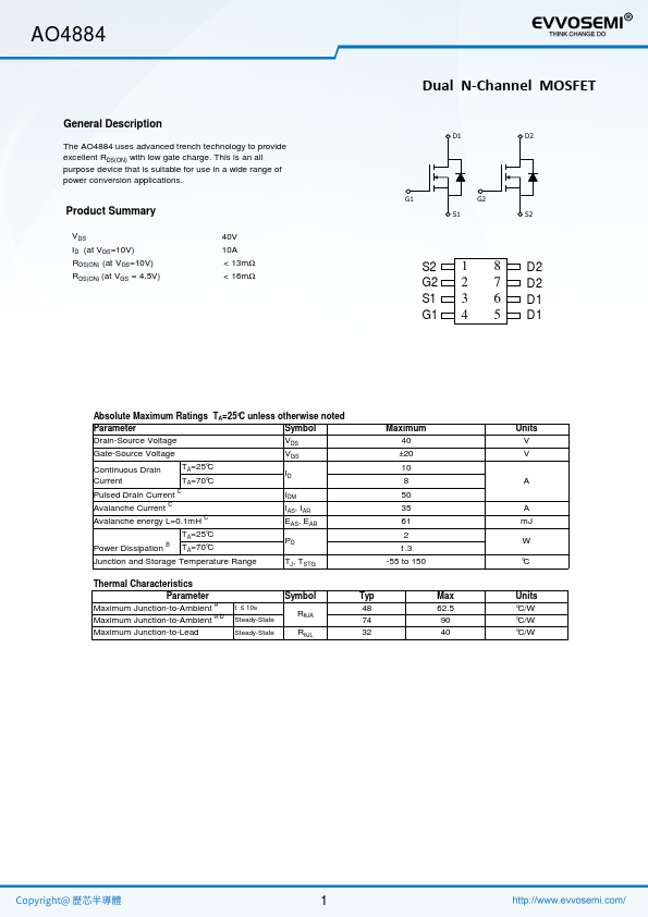 The AO4884 uses advanced trench technology to provide excellent RDS(ON) with low gate charge. This is an all purpose device that is suitable for use in a wide range of power conversion applications.