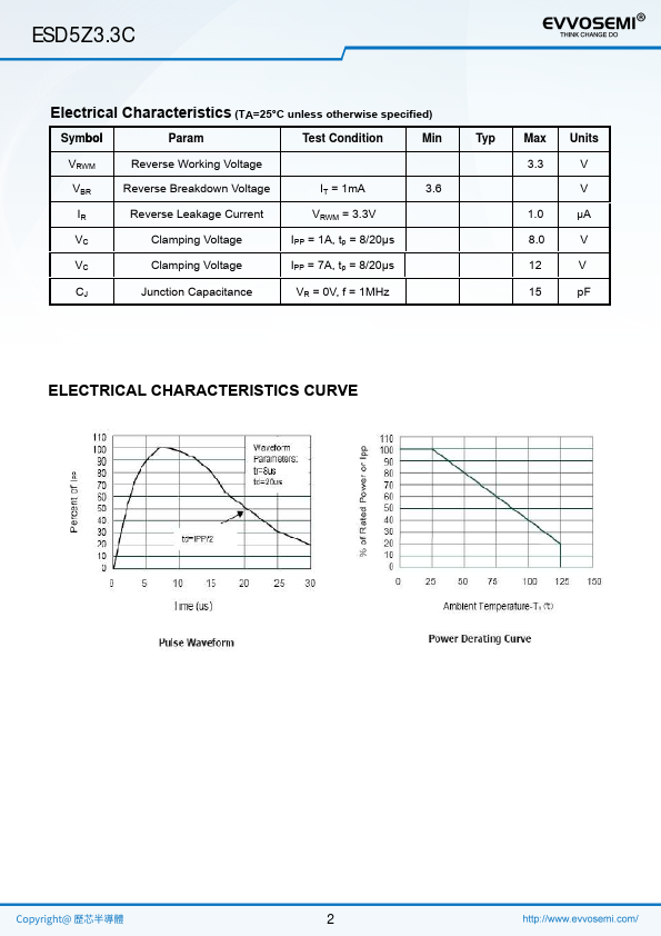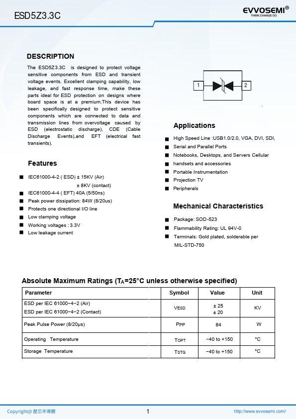 The ESD5Z 3.3C is designed to protect voltage sensitive ponents from ESD and transient voltage events. Excellent clamping capability, low leakage, and fast response time, make these parts ideal for ESD protection on designs where board space is at a premium.This device has been specifically designed to protect sensitive ponents which are connected to data and transmission lines from overvoltage caused by ESD...
