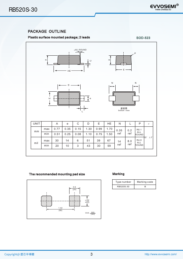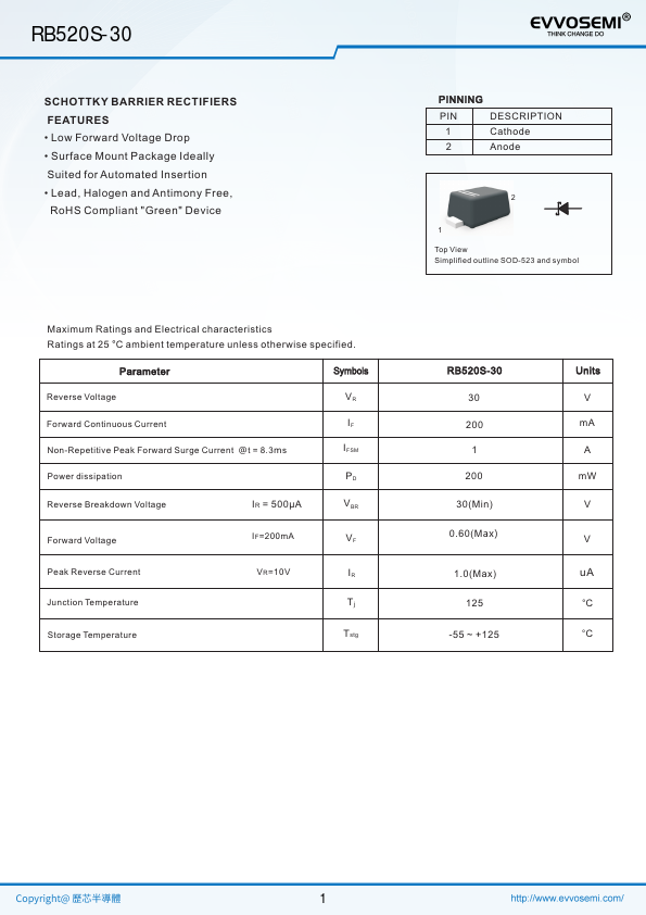1 Cathode 2 Anode 2 1 Top View Simplified outline SOD-523 and symbol RB520S-30 30 200 1 200 30(Min) 0.60(Max) 1.0(Max) 125 -55 ~ +125 Units V mA A mW V V uA °C °C 1 RB520S-30 Power Dissipation PD (mW) Fig.1 Power Derating Curve 250 200 150 100 50 0 25 50 75.