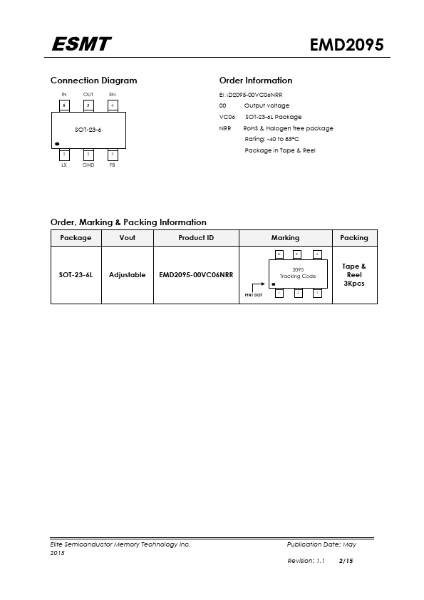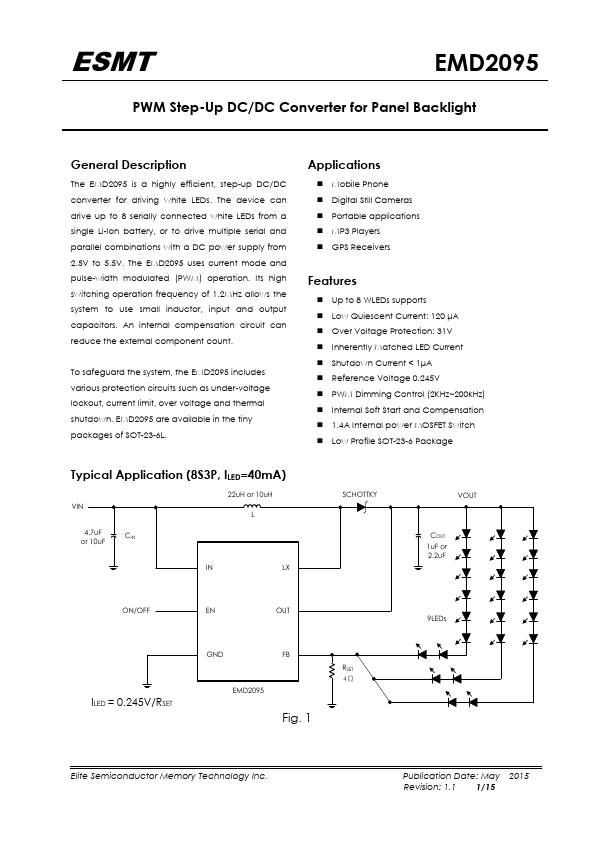 The EMD2095 is a highly efficient, step-up DC/DC converter for driving white LEDs. The device can drive up to 8 serially connected white LEDs from a single Li-Ion battery, or to drive multiple serial and parallel binations with a DC power supply from 2.5V to 5.5V. The EMD2095 uses current mode and pulse-width modulated (PWM) operation.