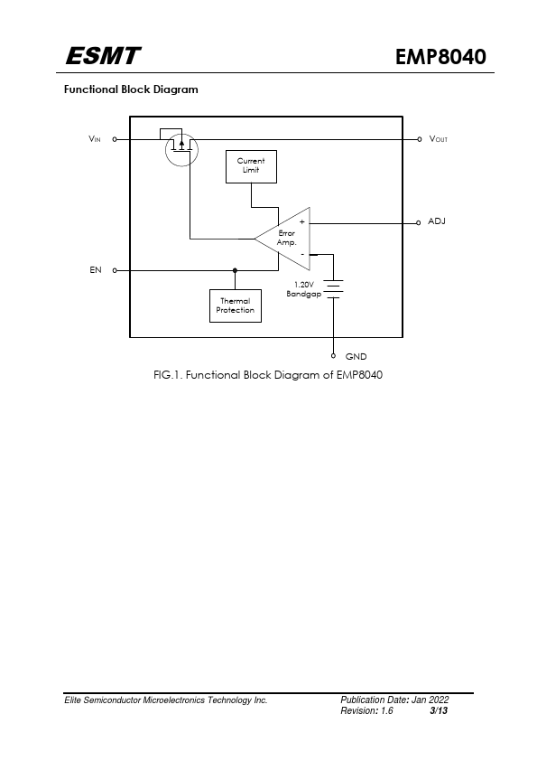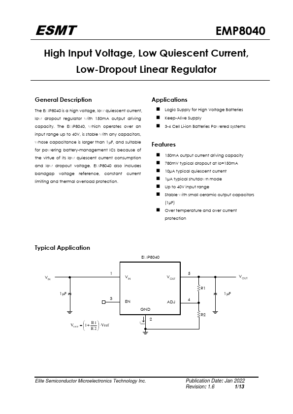 The EMP8040 is a high voltage, low quiescent current, low dropout regulator with 150mA output driving capacity. The EMP8040, which operates over an input range up to 40V, is stable with any capacitors, whose capacitance is larger than 1F, and suitable for powering battery-management ICs because of the virtue of its low quiescent current consumption and low dropout voltage. EMP8040 also includes bandgap voltage...