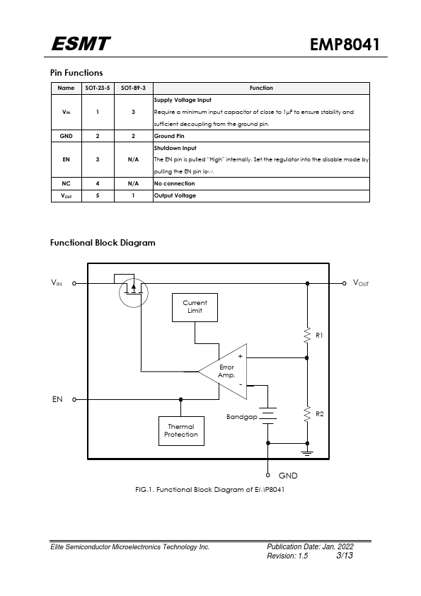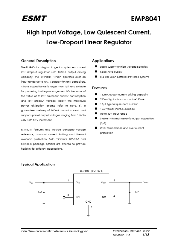 The EMP8041 is a high voltage, low quiescent current, low dropout regulator with 150mA output driving capacity. The EMP8041, which operates over an input range up to 40V, is stable with any capacitors, whose capacitance is larger than 1F, and suitable for powering battery-management ICs because of the virtue of its low quiescent current consumption and low dropout voltage. Below the maximum power dissipation...