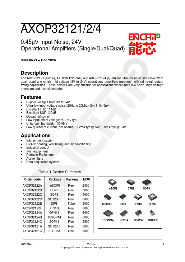 AXOP32121/2/4 0.45μV Input Noise, 24V Operational Amplifiers (Single/Dual/Quad) - Dec 2024 Description The AXOP32121 (single), AXOP32122 (dual) and AXOP32124 (quad) are ultra-low noise, ultra-low offset dual, quad and single mid voltage (3V to 24V) operational amplifiers (opamps) with rail-to-rail output swing capabilities. These devices are very suitable for applications where ultra-low noise, high voltage operation and a small footprint. Features - Supply voltages from 3V to 24V - Ultra-low input voltage noise (20Hz to 20kHz) G=+1, 0.45μV - Excellent THD 114dB - Excellent SNR 120dB - Output rail-to-rail - Low input offset voltage: ±0.1mV typ - Unity-gain bandwidth: 30MHz - Low...
