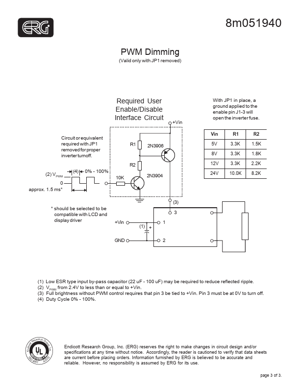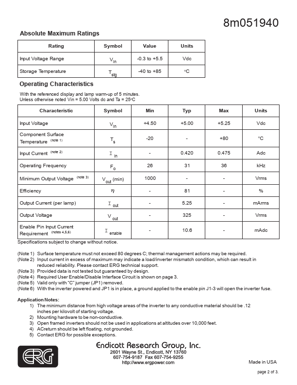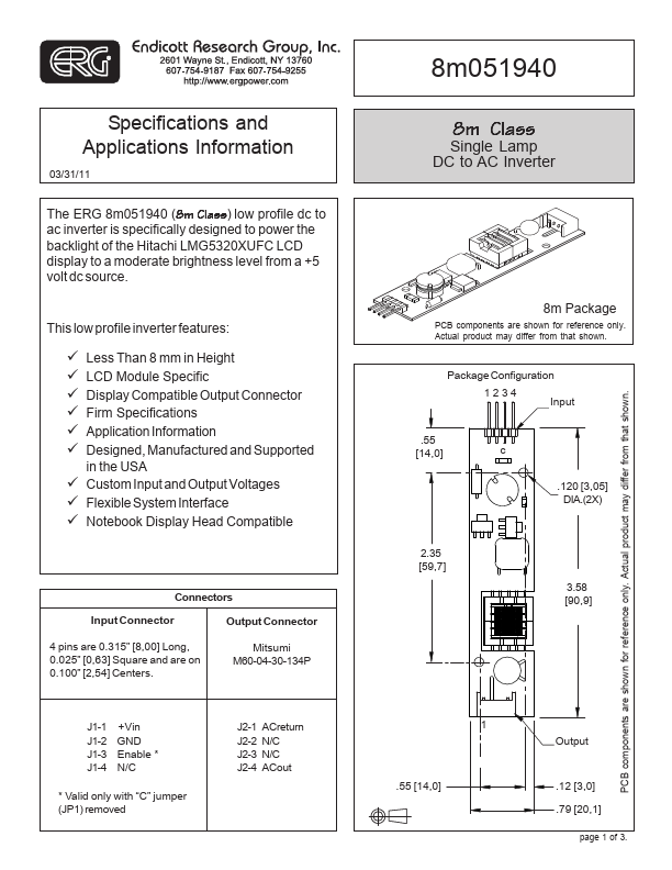 Specifications and Applications Information 03/31/11 The ERG 8m051940 (8m Class) low profile dc to ac inverter is specifically designed to power the backlight of the Hitachi LMG5320XUFC LCD display to a moderate brightness level from a +5 volt dc source. This low profile inverter.