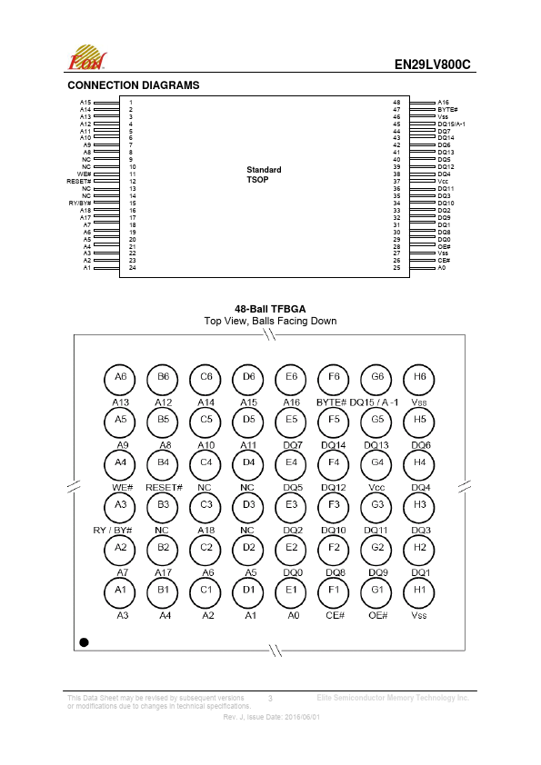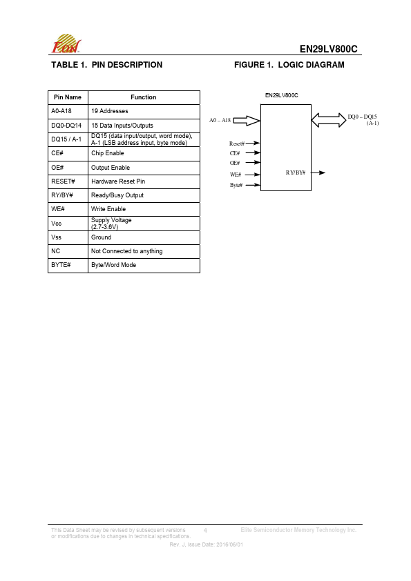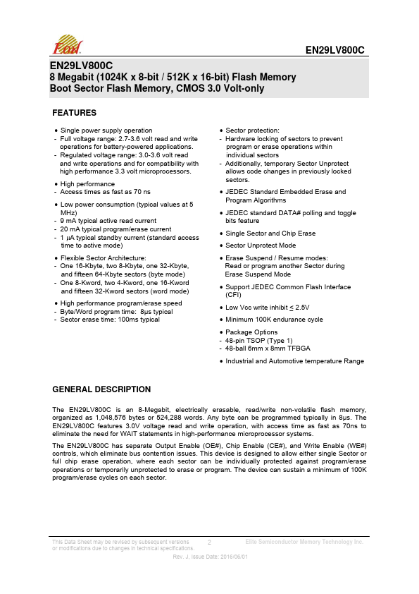 EN29LV800C is 8 Megabit (1024K x 8-bit / 512K x 16-bit) Flash Memory manufactured by Elite Semiconductor Microelectronics Technology.
