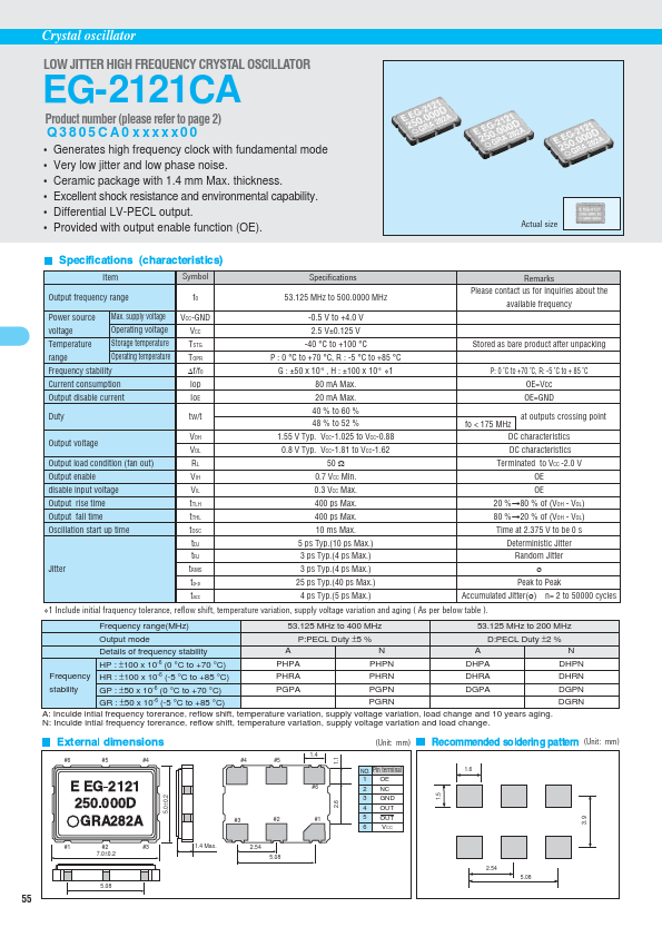 Crystal oscillator LOW JITTER HIGH FREQUENCY CRYSTAL OSCILLATOR EG-2121CA Product number (please refer to page 2) Q3805CA0 xxxxx00 Generates high frequency clock with fundamental mode Very low jitter and low phase noise. Ceramic package with 1.4 mm Max. Excellent shock resistance and environmental capability.