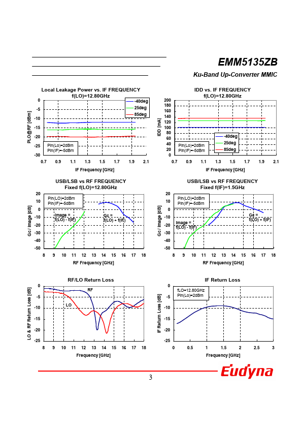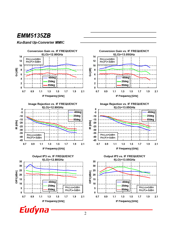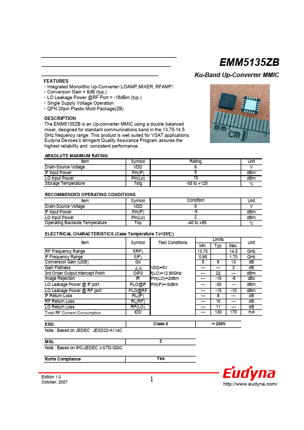 The EMM5135ZB is an Up-converter MMIC using a double balanced mixer, designed for standard munications band in the 13.75-14.5 GHz frequency range. This product is well suited for VSAT applications. Eudyna Devices’s stringent Quality Assurance Program assures the highest reliability and consistent performance.