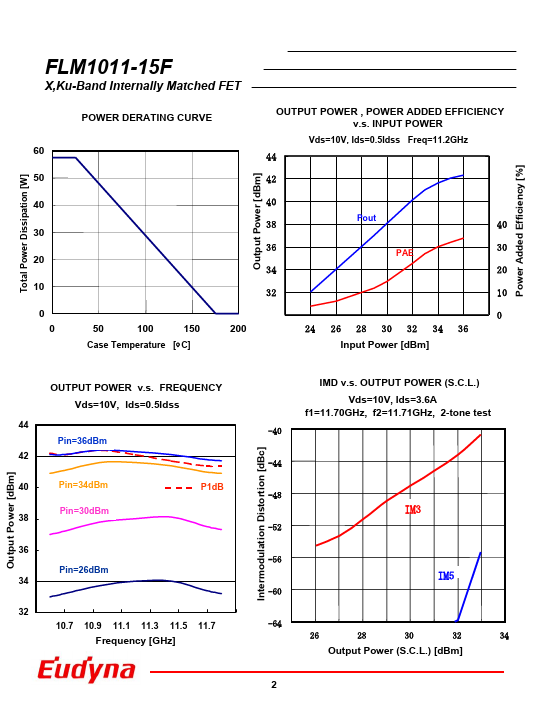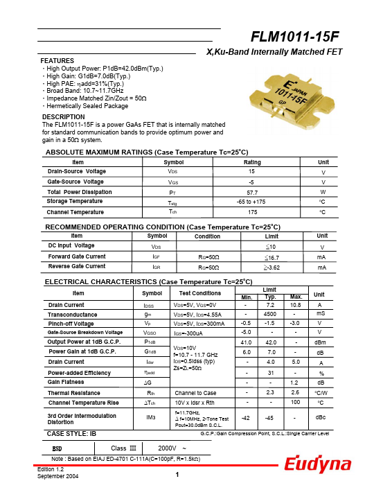- High Output Power: P1dB=42.0dBm(Typ.) -High Gain: G1dB=7.0dB(Typ.) -High PAE: ηadd=31%(Typ.) -Broad Band: 10.7~11.7GHz -