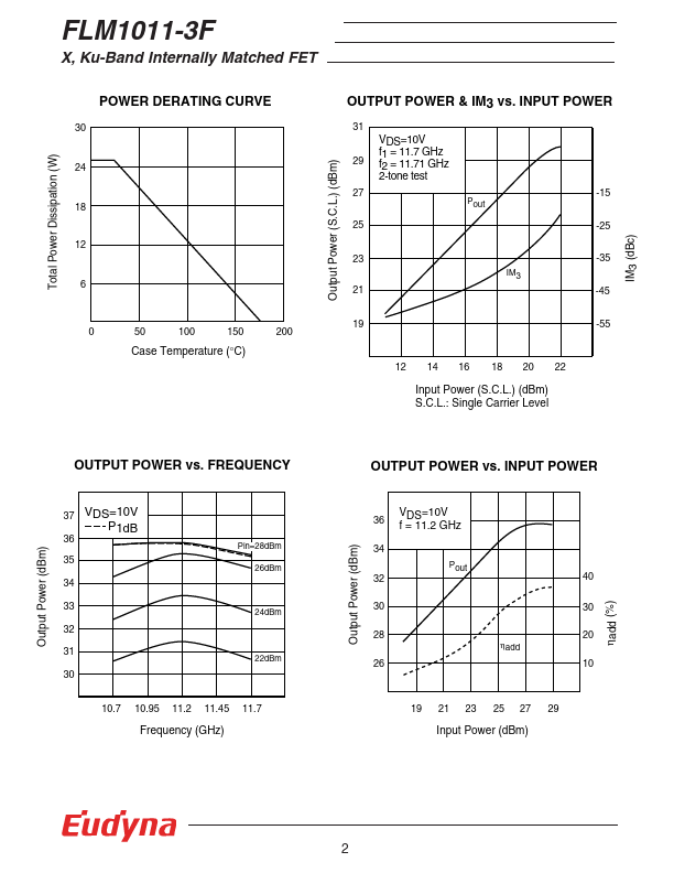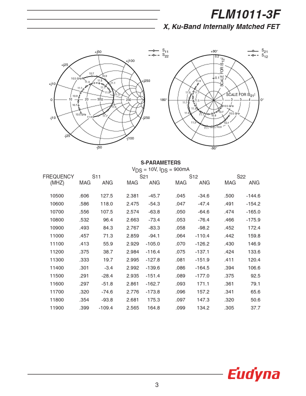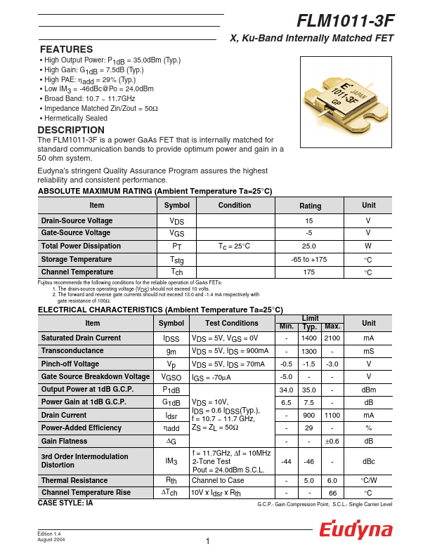 The FLM1011-3F is a power GaAs FET that is internally matched for standard munication bands to provide optimum power and gain in a 50 ohm system. Eudyna’s stringent Quality Assurance Program assures the highest reliability and consistent performance. RATING (Ambient Temperature Ta=25°C) Item Symbol Condition Rating Unit Drain-Source Voltage VDS 15 V Gate-Source Voltage VGS -5 V Total Power Dissipation PT Tc = 25°C...
