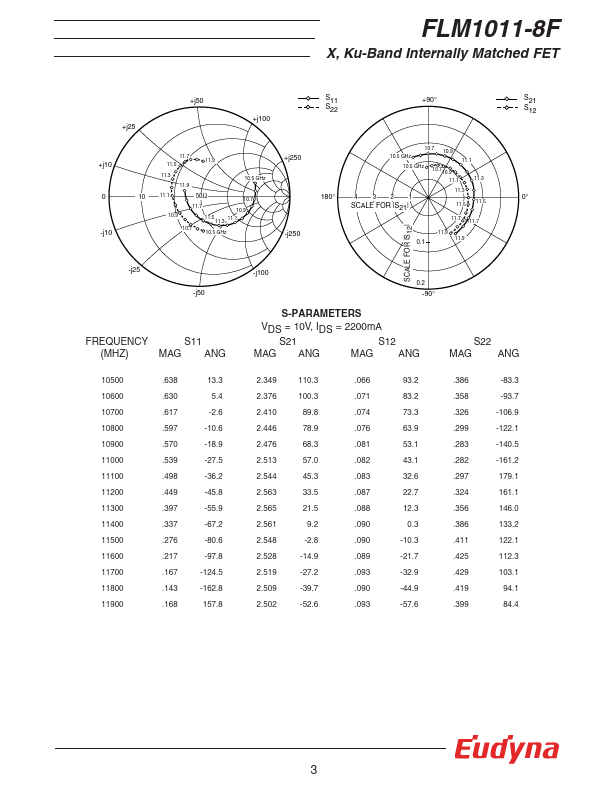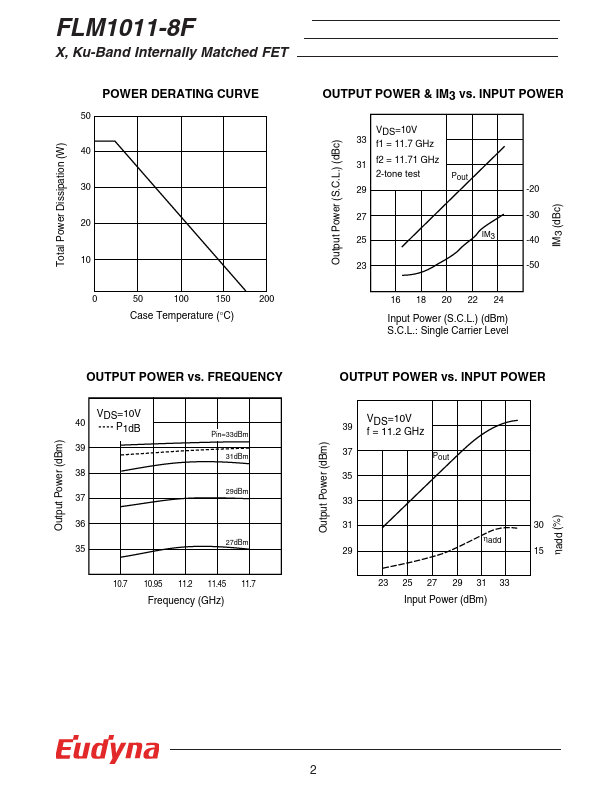 The FLM1011-8F is a power GaAs FET that is internally matched for standard munication bands to provide optimum power and gain in a 50 ohm system. Eudyna’s stringent Quality Assurance Program assures the highest reliability and consistent performance. RATING (Ambient Temperature Ta=25°C) Item Symbol Condition Rating Unit Drain-Source Voltage VDS 15 V Gate-Source Voltage VGS -5 V Total Power Dissipation PT Tc = 25°C...