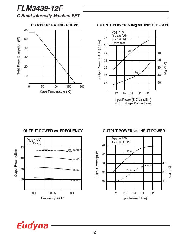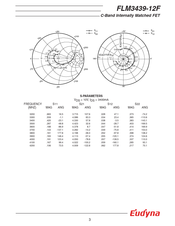 The FLM3439-12F is a power GaAs FET that is internally matched for standard munication bands to provide optimum power and gain in a 50 ohm system. Eudyna’s stringent Quality Assurance Program assures the highest reliability and consistent performance. RATING (Ambient Temperature Ta=25°C) Item Symbol Condition Rating Unit Drain-Source Voltage VDS 15 V Gate-Source Voltage VGS -5 V Total Power Dissipation PT Tc = 25°C...