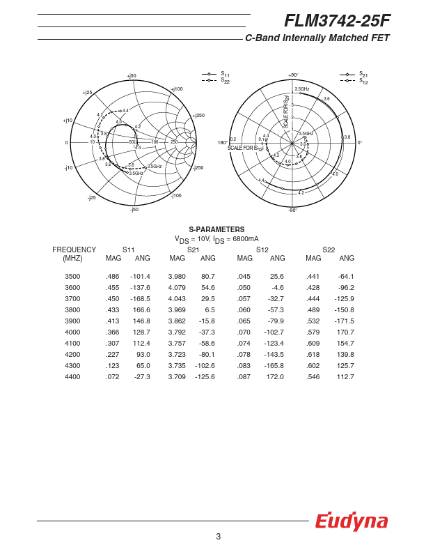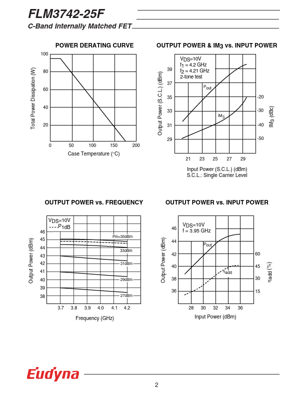 The FLM3742-25F is a power GaAs FET that is internally matched for standard munication bands to provide optimum power and gain in a 50 ohm system. Eudyna’s stringent Quality Assurance Program assures the highest reliability and consistent performance. RATING (Ambient Temperature Ta=25°C) Item Symbol Condition Rating Unit Drain-Source Voltage Gate-Source Voltage VDS VGS 15 V -5 V Total Power Dissipation PT Tc = 25°C...