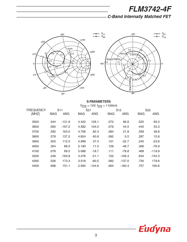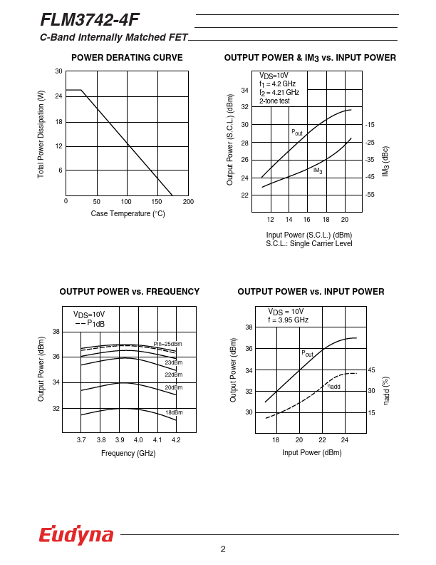 The FLM3742-4F is a power GaAs FET that is internally matched for standard munication bands to provide optimum power and gain in a 50 ohm system. Eudyna’s stringent Quality Assurance Program assures the highest reliability and consistent performance. RATING (Ambient Temperature Ta=25°C) Item Symbol Condition Rating Unit Drain-Source Voltage Gate-Source Voltage VDS VGS 15 V -5 V Total Power Dissipation PT Tc = 25°C...