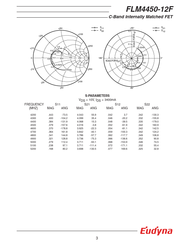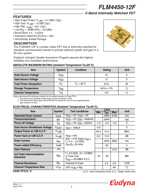 The FLM4450-12F is a power GaAs FET that is internally matched for standard munication bands to provide optimum power and gain in a 50 ohm system. Eudyna’s stringent Quality Assurance Program assures the highest reliability and consistent performance. RATING (Ambient Temperature Ta=25°C) Item Symbol Condition Rating Unit Drain-Source Voltage VDS 15 V Gate-Source Voltage VGS -5 V Total Power Dissipation PT Tc = 25°C...