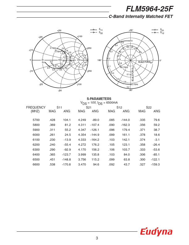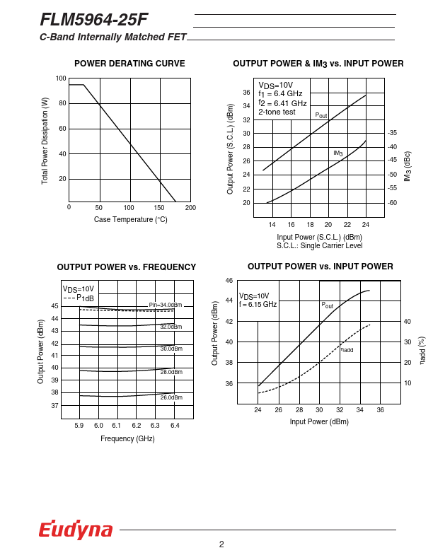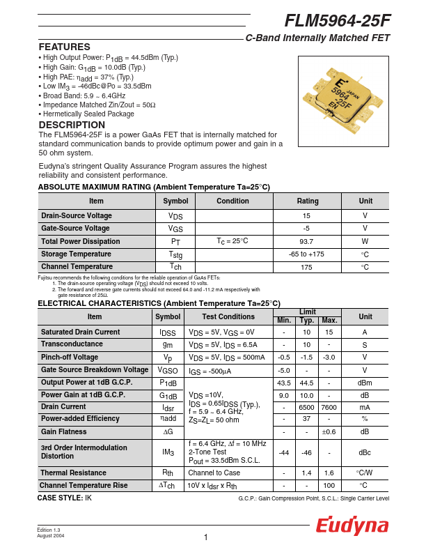 The FLM5964-25F is a power GaAs FET that is internally matched for standard munication bands to provide optimum power and gain in a 50 ohm system. Eudyna’s stringent Quality Assurance Program assures the highest reliability and consistent performance. RATING (Ambient Temperature Ta=25°C) Item Symbol Condition Rating Unit Drain-Source Voltage VDS 15 V Gate-Source Voltage VGS -5 V Total Power Dissipation PT Tc = 25°C...