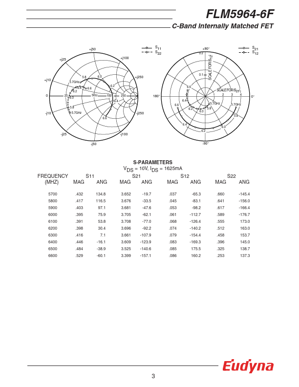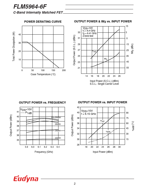 The FLM5964-6F is a power GaAs FET that is internally matched for standard munication bands to provide optimum power and gain in a 50 ohm system. Eudyna’s stringent Quality Assurance Program assures the highest reliability and consistent performance. RATING (Ambient Temperature Ta=25°C) Item Symbol Condition Rating Unit Drain-Source Voltage VDS 15 V Gate-Source Voltage VGS -5 V Total Power Dissipation PT Tc = 25°C...