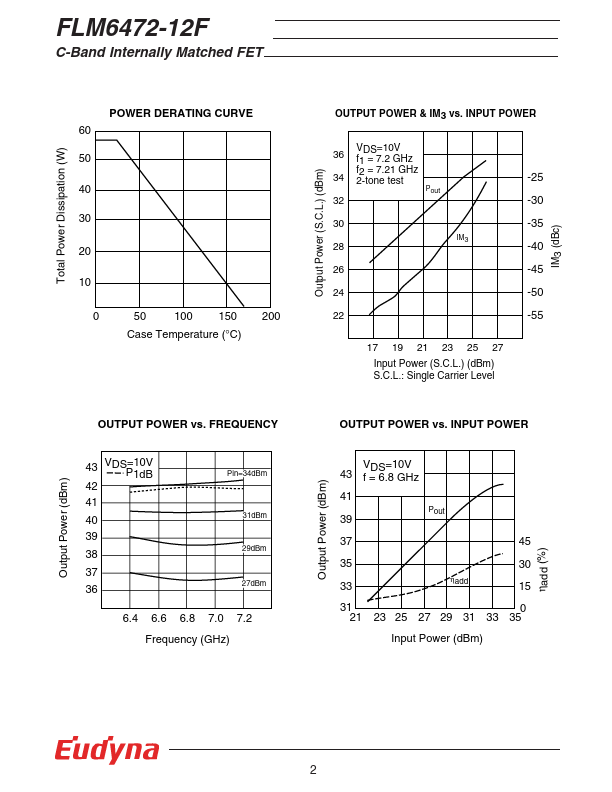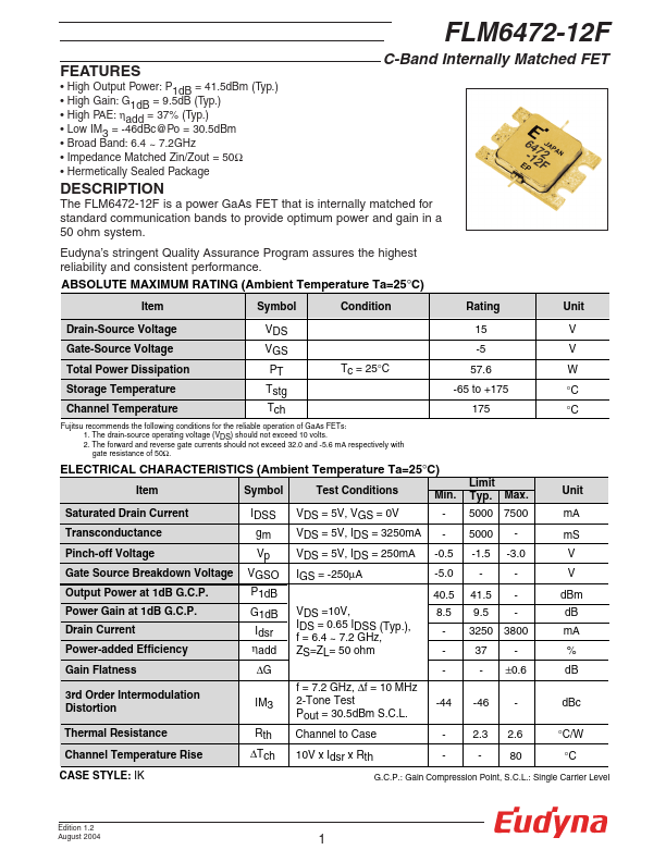 The FLM6472-12F is a power GaAs FET that is internally matched for standard munication bands to provide optimum power and gain in a 50 ohm system. Eudyna’s stringent Quality Assurance Program assures the highest reliability and consistent performance. RATING (Ambient Temperature Ta=25°C) Item Symbol Condition Rating Unit Drain-Source Voltage Gate-Source Voltage VDS VGS 15 V -5 V Total Power Dissipation PT Tc = 25°C...