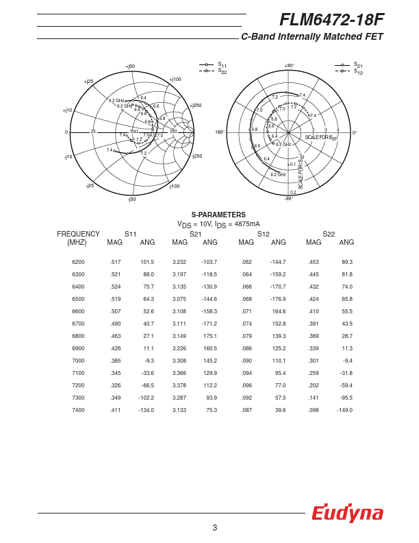 The FLM6472-18F is a power GaAs FET that is internally matched for standard munication bands to provide optimum power and gain in a 50 ohm system. Eudyna’s stringent Quality Assurance Program assures the highest reliability and consistent performance. RATING (Ambient Temperature Ta=25°C) Item Symbol Condition Rating Unit Drain-Source Voltage Gate-Source Voltage VDS VGS 15 V -5 V Total Power Dissipation PT Tc = 25°C...