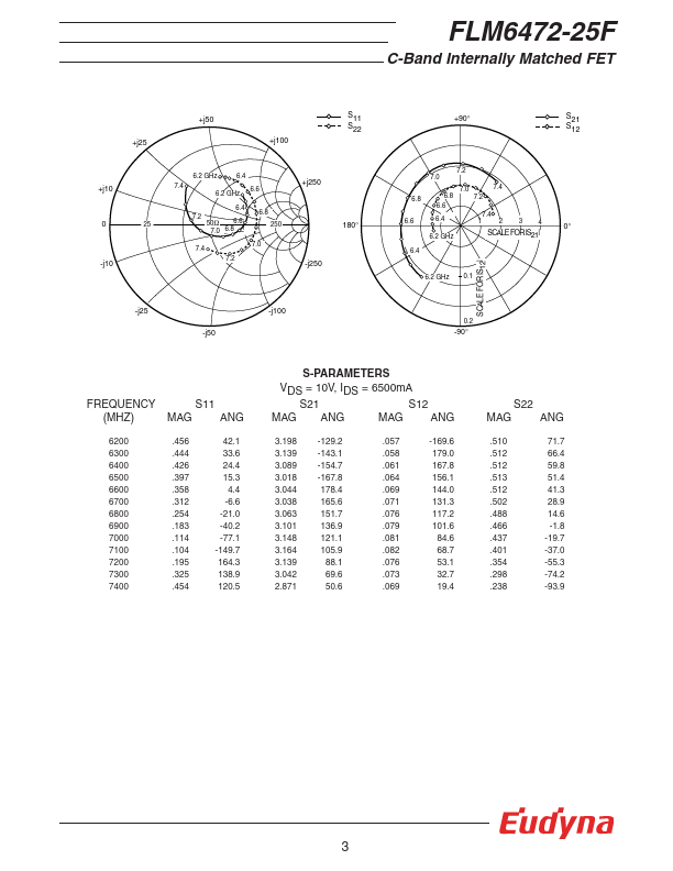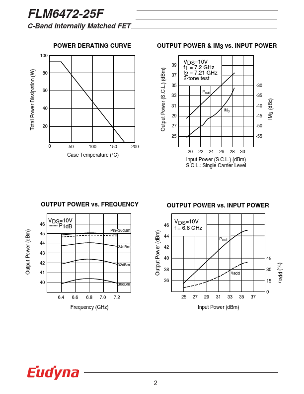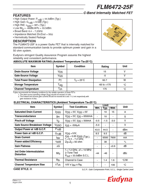 The FLM6472-25F is a power GaAs FET that is internally matched for standard munication bands to provide optimum power and gain in a 50 ohm system. Eudyna’s stringent Quality Assurance Program assures the highest reliability and consistent performance. RATING (Ambient Temperature Ta=25°C) Item Symbol Condition Rating Unit Drain-Source Voltage Gate-Source Voltage VDS VGS 15 V -5 V Total Power Dissipation PT Tc = 25°C...