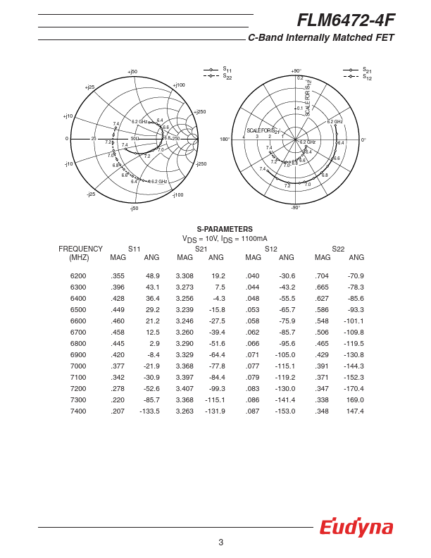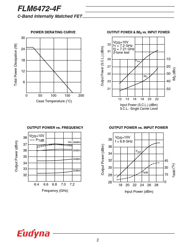 The FLM6472-4F is a power GaAs FET that is internally matched for standard munication bands to provide optimum power and gain in a 50 ohm system. Eudyna’s stringent Quality Assurance Program assures the highest reliability and consistent performance. RATING (Ambient Temperature Ta=25°C) Item Symbol Condition Rating Unit Drain-Source Voltage Gate-Source Voltage VDS VGS 15 V -5 V Total Power Dissipation PT Tc = 25°C...