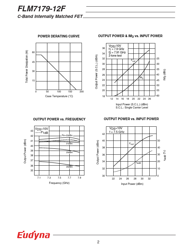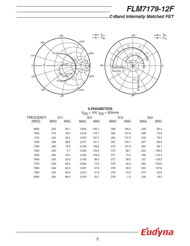 The FLM7179-12F is a power GaAs FET that is internally matched for standard munication bands to provide optimum power and gain in a 50 ohm system. Eudyna’s stringent Quality Assurance Program assures the highest reliability and consistent performance. RATING (Ambient Temperature Ta=25°C) Item Symbol Condition Rating Unit Drain-Source Voltage VDS 15 V Gate-Source Voltage VGS -5 V Total Power Dissipation PT Tc = 25°C...