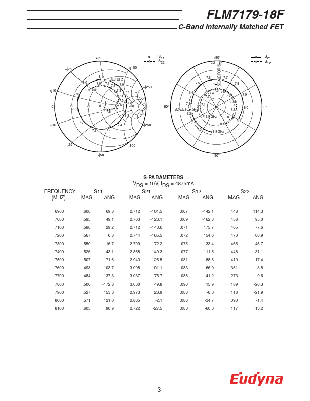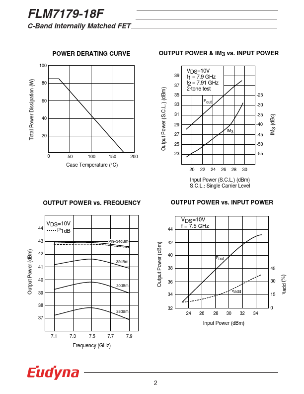 The FLM7179-18F is a power GaAs FET that is internally matched for standard munication bands to provide optimum power and gain in a 50 ohm system. Eudyna’s stringent Quality Assurance Program assures the highest reliability and consistent performance. RATING (Ambient Temperature Ta=25°C) Item Symbol Condition Rating Unit Drain-Source Voltage VDS 15 V Gate-Source Voltage VGS -5 V Total Power Dissipation PT Tc = 25°C...