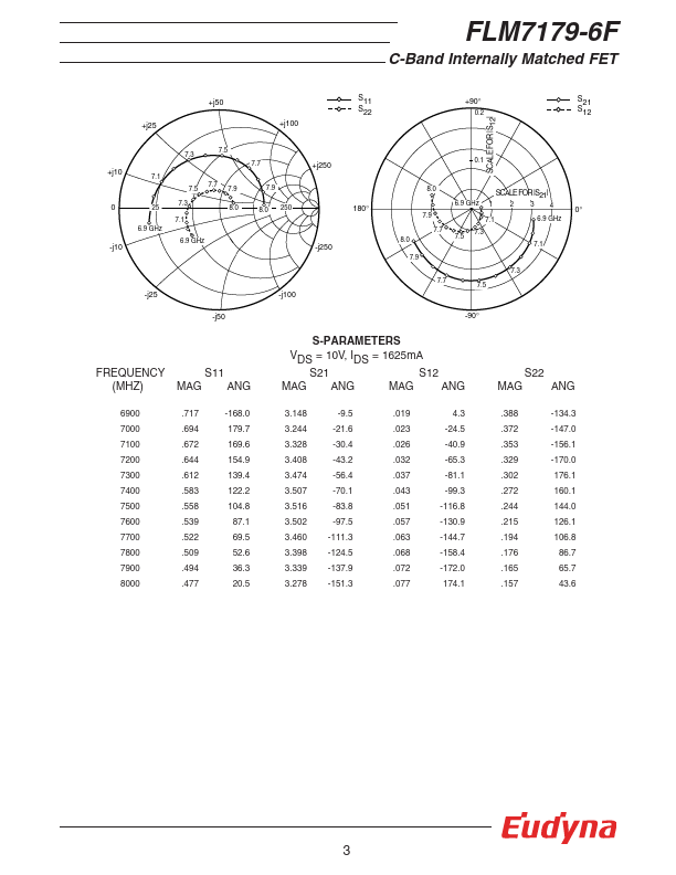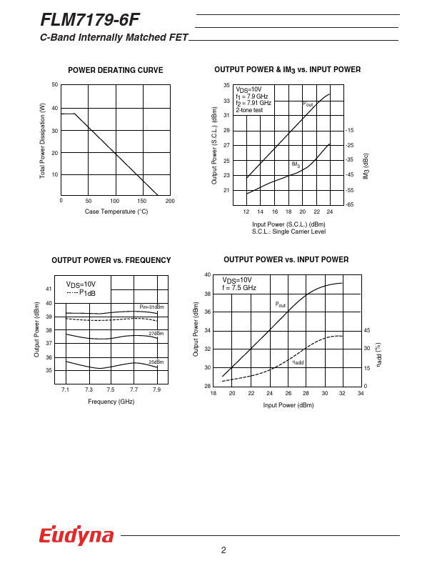 The FLM7179-6F is a power GaAs FET that is internally matched for standard munication bands to provide optimum power and gain in a 50 ohm system. Eudyna’s stringent Quality Assurance Program assures the highest reliability and consistent performance. RATING (Ambient Temperature Ta=25°C) Item Symbol Condition Rating Unit Drain-Source Voltage VDS 15 V Gate-Source Voltage VGS -5 V Total Power Dissipation PT Tc = 25°C...