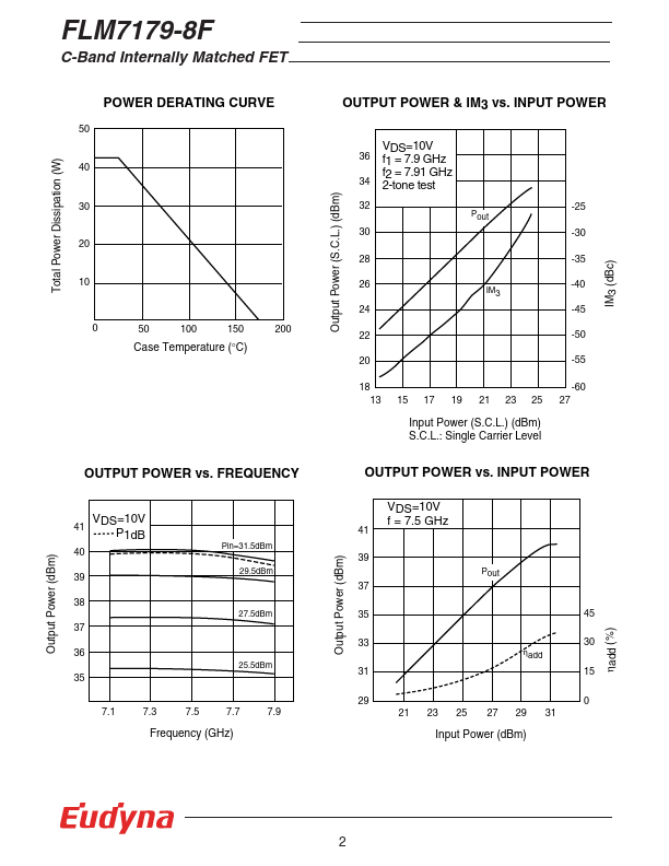 The FLM7179-8F is a power GaAs FET that is internally matched for standard munication bands to provide optimum power and gain in a 50 ohm system. Eudyna’s stringent Quality Assurance Program assures the highest reliability and consistent performance. RATING (Ambient Temperature Ta=25°C) Item Symbol Condition Rating Unit Drain-Source Voltage Gate-Source Voltage VDS VGS 15 V -5 V Total Power Dissipation PT Tc = 25°C...