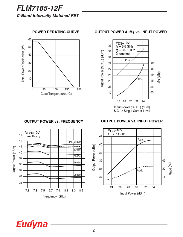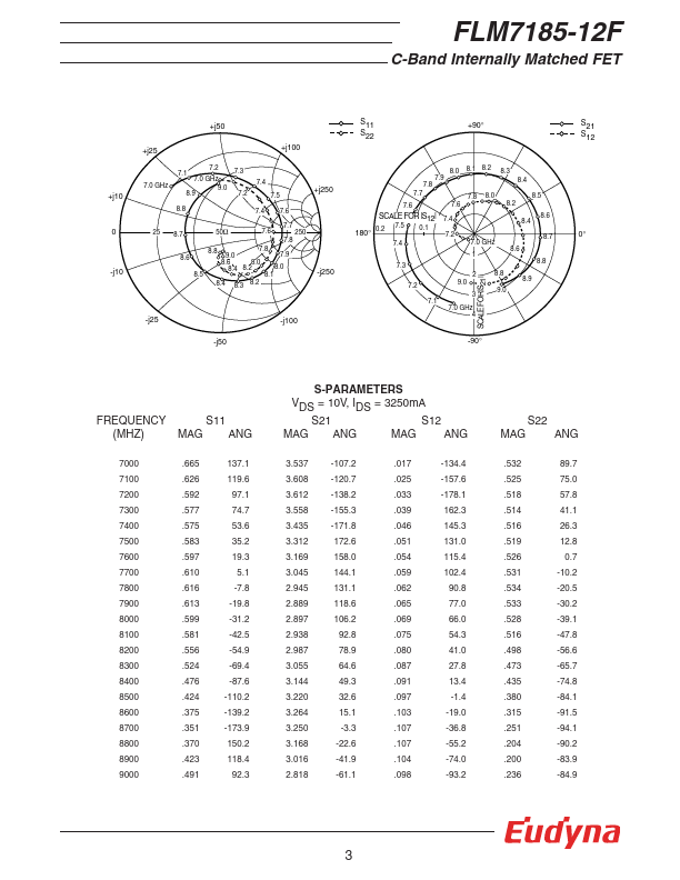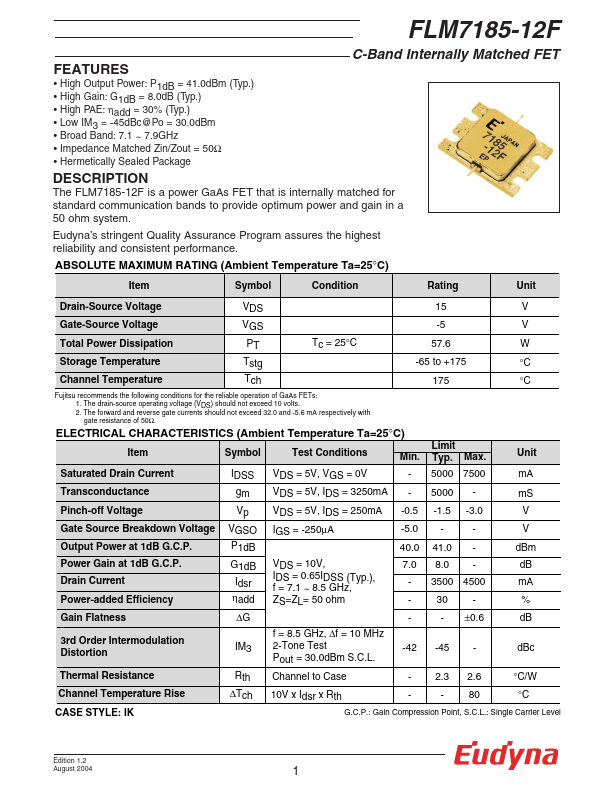 The FLM7185-12F is a power GaAs FET that is internally matched for standard munication bands to provide optimum power and gain in a 50 ohm system. Eudyna’s stringent Quality Assurance Program assures the highest reliability and consistent performance. RATING (Ambient Temperature Ta=25°C) Item Symbol Condition Rating Unit Drain-Source Voltage VDS 15 V Gate-Source Voltage VGS -5 V Total Power Dissipation PT Tc = 25°C...