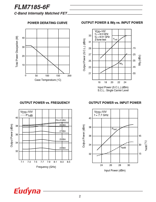 The FLM7185-6F is a power GaAs FET that is internally matched for standard munication bands to provide optimum power and gain in a 50 ohm system. Eudyna’s stringent Quality Assurance Program assures the highest reliability and consistent performance. RATING (Ambient Temperature Ta=25°C) Item Symbol Condition Rating Unit Drain-Source Voltage VDS 15 V Gate-Source Voltage VGS -5 V Total Power Dissipation PT Tc = 25°C...