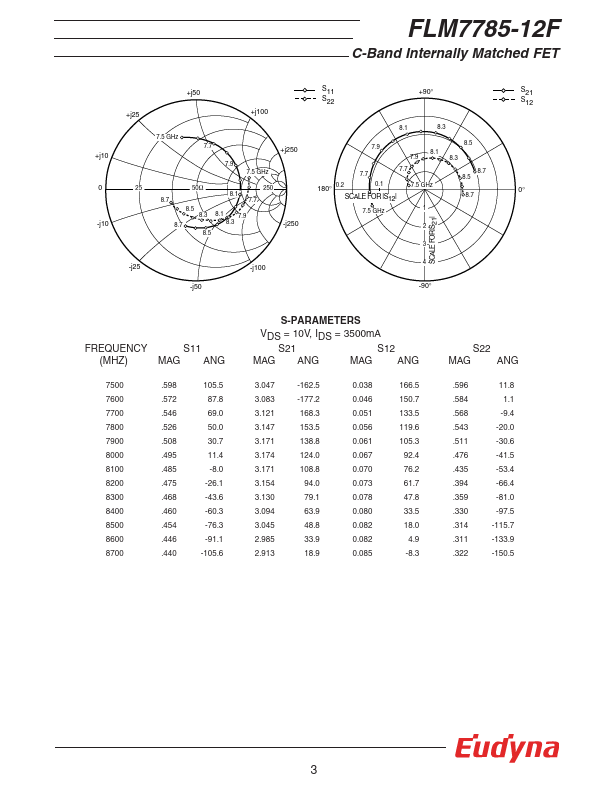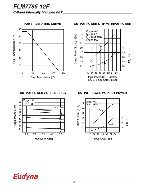 The FLM7785-12F is a power GaAs FET that is internally matched for standard munication bands to provide optimum power and gain in a 50 ohm system. Eudyna’s stringent Quality Assurance Program assures the highest reliability and consistent performance. RATING (Ambient Temperature Ta=25°C) Item Symbol Condition Rating Unit Drain-Source Voltage VDS 15 V Gate-Source Voltage VGS -5 V Total Power Dissipation PT Tc = 25°C...