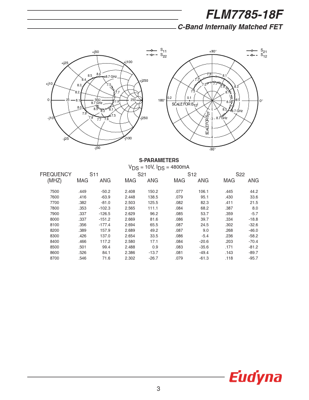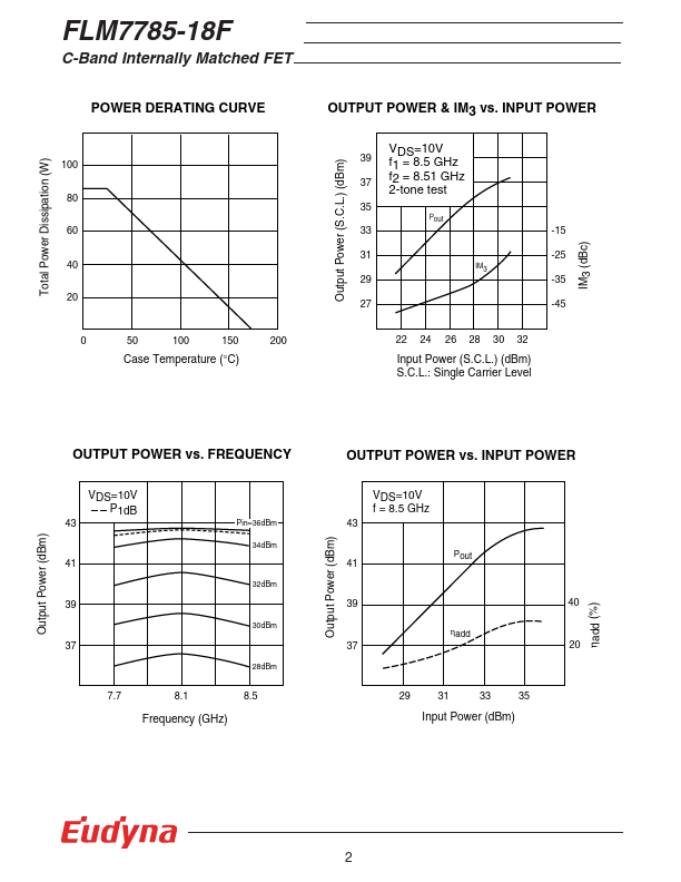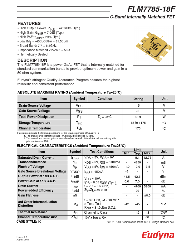 The FLM7785-18F is a power GaAs FET that is internally matched for standard munication bands to provide optimum power and gain in a 50 ohm system. Eudyna’s stringent Quality Assurance Program assures the highest reliability and consistent performance. RATING (Ambient Temperature Ta=25°C) Item Symbol Condition Rating Unit Drain-Source Voltage VDS 15 V Gate-Source Voltage VGS -5 V Total Power Dissipation PT Tc = 25°C...