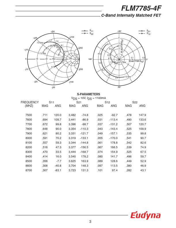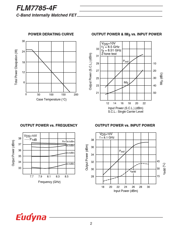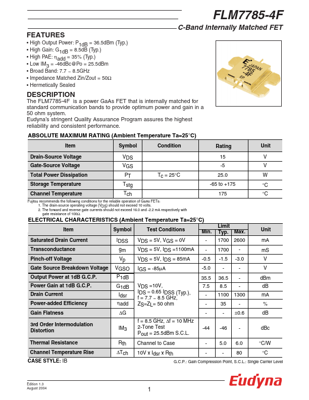 The FLM7785-4F is a power GaAs FET that is internally matched for standard munication bands to provide optimum power and gain in a 50 ohm system. Eudyna’s stringent Quality Assurance Program assures the highest reliability and consistent performance. RATING (Ambient Temperature Ta=25°C) Item Symbol Condition Rating Unit Drain-Source Voltage VDS 15 V Gate-Source Voltage VGS -5 V Total Power Dissipation PT Tc = 25°C...