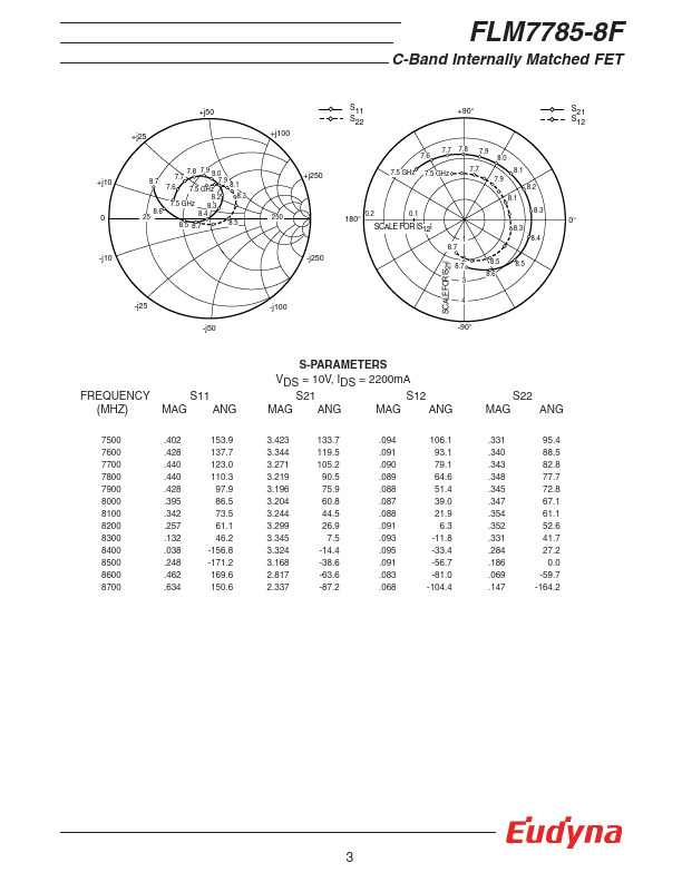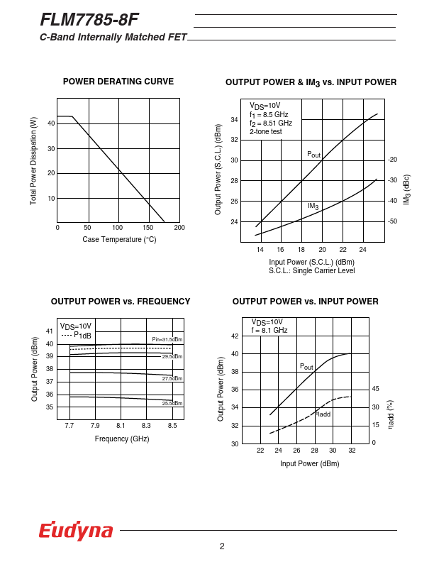 The FLM7785-8F is a power GaAs FET that is internally matched for standard munication bands to provide optimum power and gain in a 50 ohm system. Eudyna’s stringent Quality Assurance Program assures the highest reliability and consistent performance. RATING (Ambient Temperature Ta=25°C) Item Symbol Condition Rating Unit Drain-Source Voltage VDS 15 V Gate-Source Voltage VGS -5 V Total Power Dissipation PT Tc = 25°C...