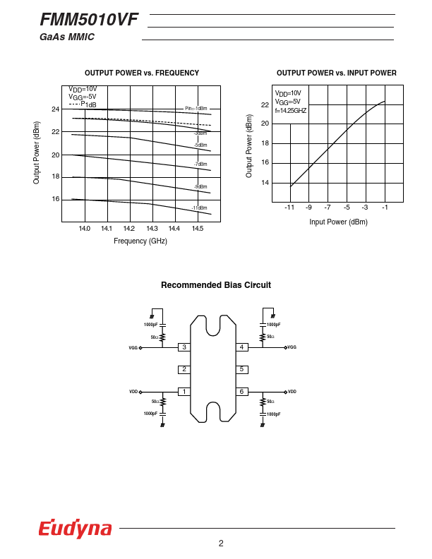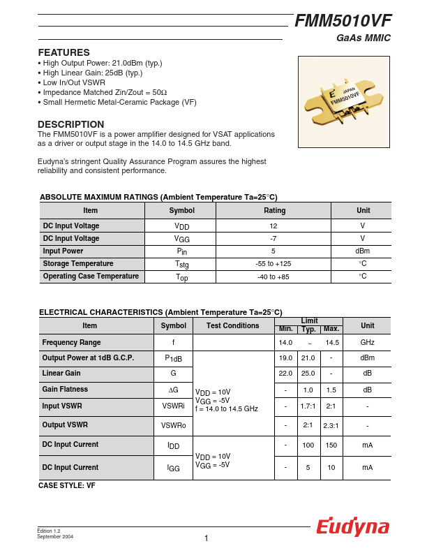 The FMM5010VF is a power amplifier designed for VSAT applications as a driver or output stage in the 14.0 to 14.5 GHz band. Eudyna’s stringent Quality Assurance Program assures the highest reliability and consistent performance. FMM5010VF GaAs MMIC RATINGS (Ambient Temperature Ta=25°C) Item Symbol Rating DC Input Voltage DC Input Voltage Input Power Storage Temperature Operating Case Temperature VDD VGG Pin Tstg Top...