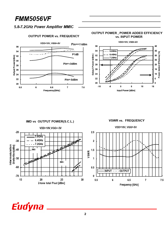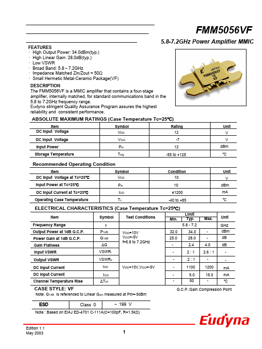 The FMM5056VF is a MMIC amplifier that contains a four-stage amplifier, internally matched, for standard munications band in the 5.8 to 7.2GHz frequency range. Eudyna stringent Quality Assurance Program assures the highest reliability and consistent performance. Frequency Range f 5.8 - 7.2 Output Power at 1dB G.C.P.