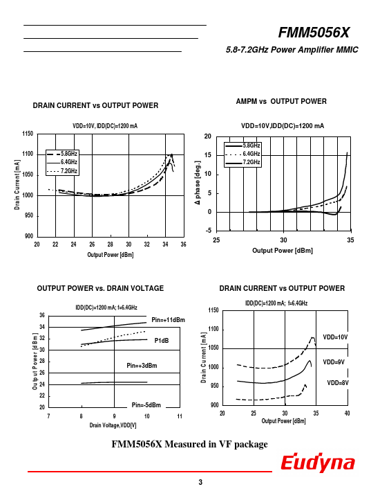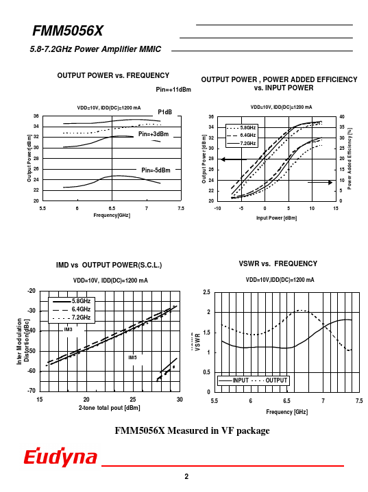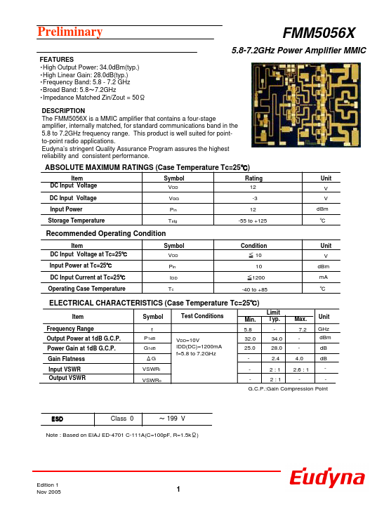The FMM5056X is a MMIC amplifier that contains a four-stage amplifier, internally matched, for standard munications band in the 5.8 to 7.2GHz frequency range. This product is well suited for pointto-point radio applications. Eudyna’s stringent Quality Assurance Program assures the highest reliability and consistent performance.