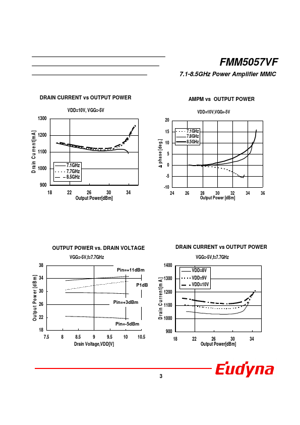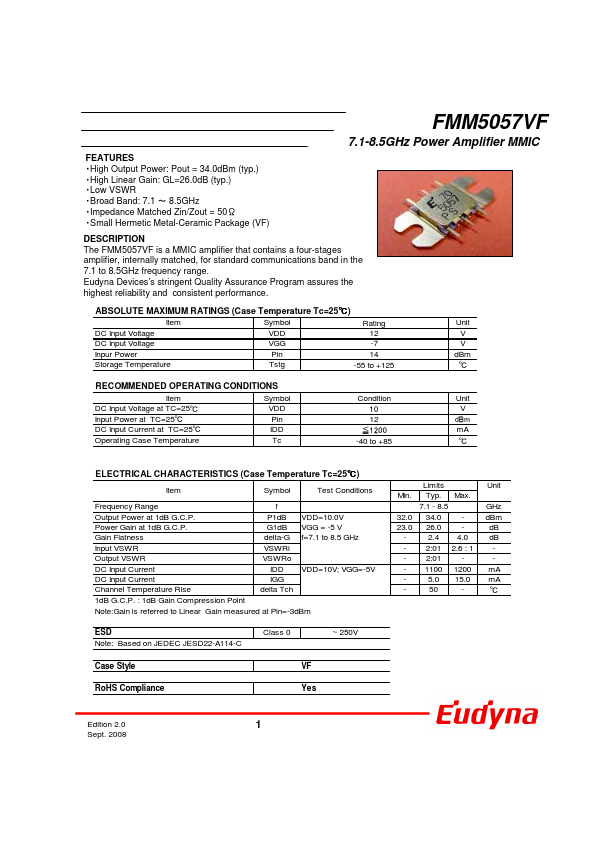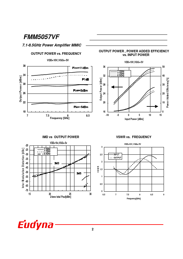 The FMM5057VF is a MMIC amplifier that contains a four-stages amplifier, internally matched, for standard munications band in the 7.1 to 8.5GHz frequency range. Eudyna Devices’s stringent Quality Assurance Program assures the highest reliability and consistent performance. P1dB VDD=10.0V Power Gain at 1dB G.C.P.