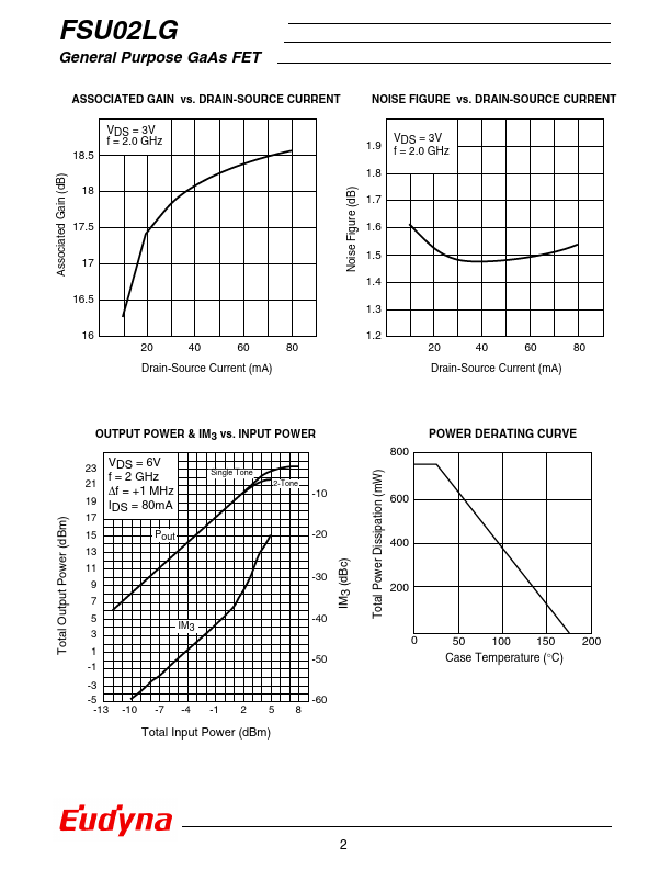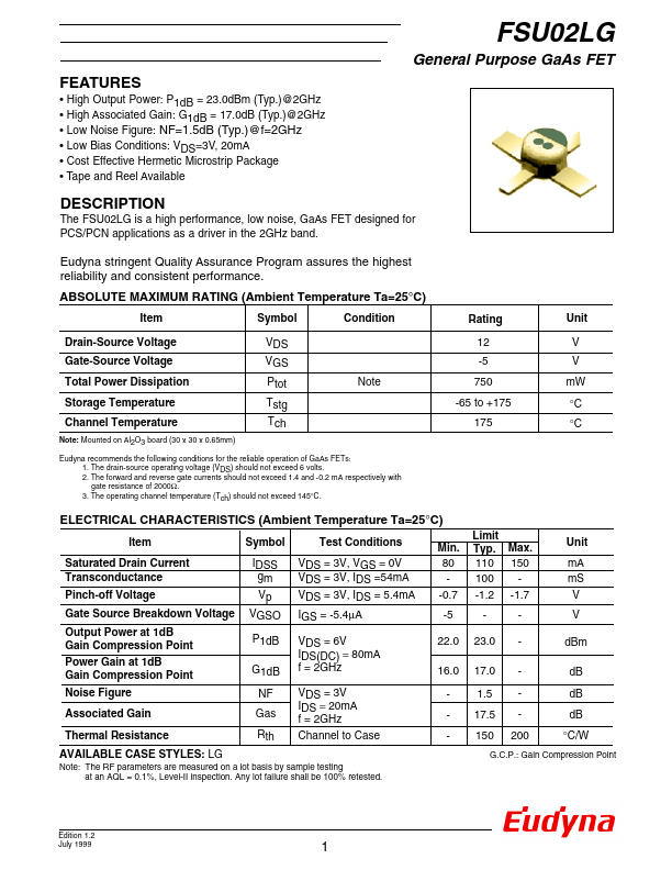 The FSU02LG is a high performance, low noise, GaAs FET designed for PCS/PCN applications as a driver in the 2GHz band. Eudyna stringent Quality Assurance Program assures the highest reliability and consistent performance. RATING (Ambient Temperature Ta=25°C) Item Symbol Condition Rating Unit Drain-Source Voltage VDS Gate-Source Voltage VGS Total Power Dissipation Ptot Note Storage Temperature Tstg Channel...