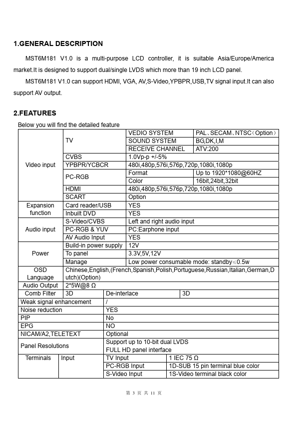 MST6M181 V1.0 is a multi-purpose LCD controller, it is suitable Asia/Europe/America market.It is designed to support dual/single LVDS which more than 19 inch LCD panel. MST6M181 V1.0 can support HDMI, VGA, AV,S-Video,YPBPR,USB,TV signal input.It can also support AV output.