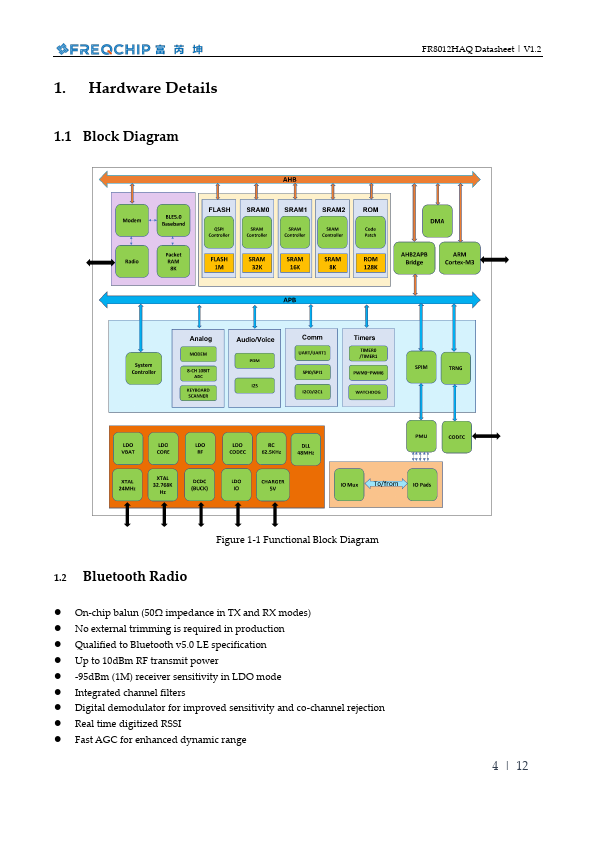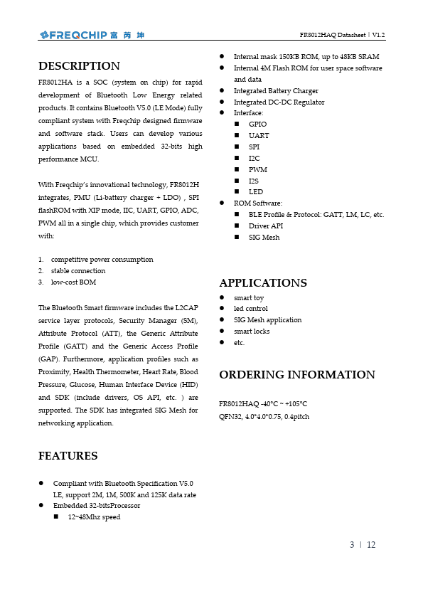 FR8012HA is a SOC (system on chip) for rapid development of Bluetooth Low Energy related products. It contains Bluetooth V5.0 (LE Mode) fully pliant system with Freqchip designed firmware and software stack. Users can develop various applications based on embedded 32-bits high performance MCU.