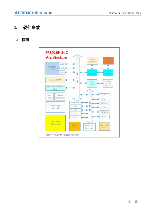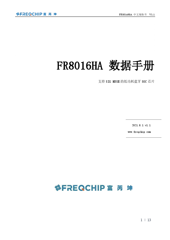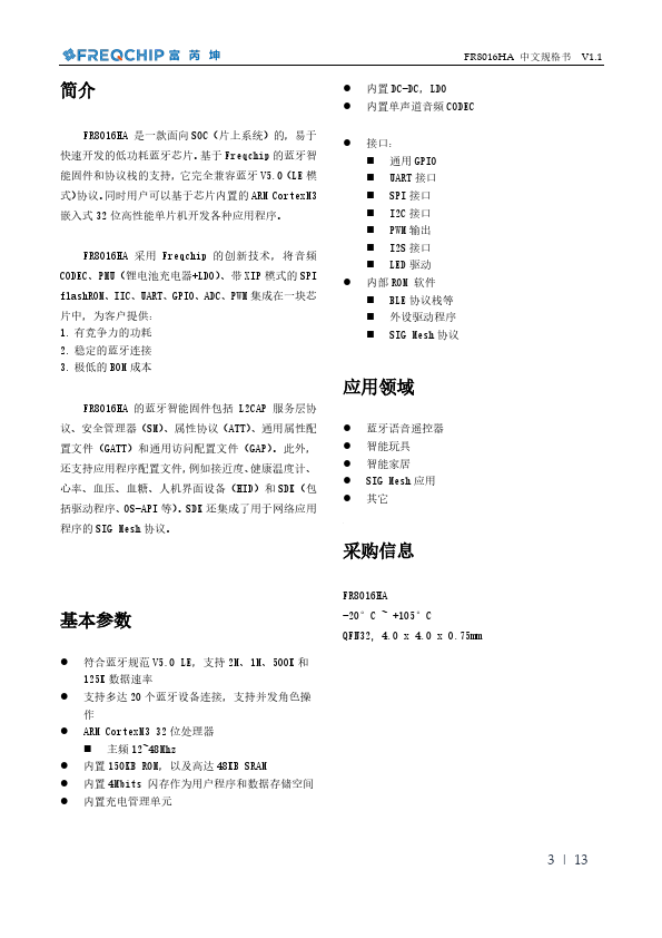FR8016HA 中文规格书 V1.1 FR8016HA 数据手册 支持 SIG MESH 的低功耗蓝牙 SOC 芯片 2021.6.1 v1.1 .freqchip. 1 | 13 简介 FR8016HA 是一款面向 SOC(片上系统)的,易于 快速开发的低功耗蓝牙芯片。基于 Freqchip 的蓝牙智 能固件和协议栈的支持,它完全兼容蓝牙 V5.0(LE 模 式)协议。同时用户可以基于芯片内置的 ARM CortexM3 嵌入式 32 位高性能单片机开发各种应用程序。 FR8016HA 采用 Freqchip 的创新技术,将音频 CODEC、PMU(锂电池充电器+LDO)、带 XIP 模式的 SPI flashROM、IIC、UART、GPIO、ADC、PWM 集成在一块芯 片中,为客户提供:.