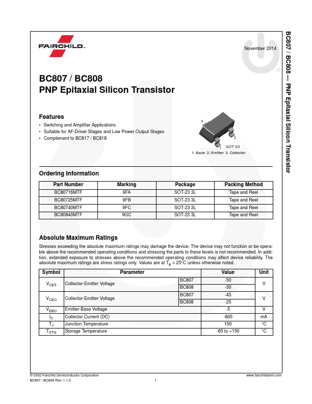 Overview: BC807 / BC808 — PNP Epitaxial Silicon Transistor November 2014 BC807 / BC808 PNP Epitaxial Silicon.