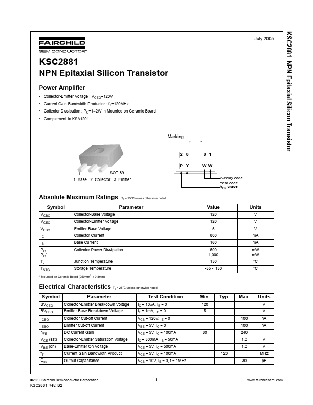 Overview: KSC2881 NPN Epitaxial Silicon Transistor July 2005 KSC2881 NPN Epitaxial Silicon Transistor Power Amplifier • Collector-Emitter Voltage : VCEO=120V • Current Gain Bandwidth Productor : fT=120MHz •.