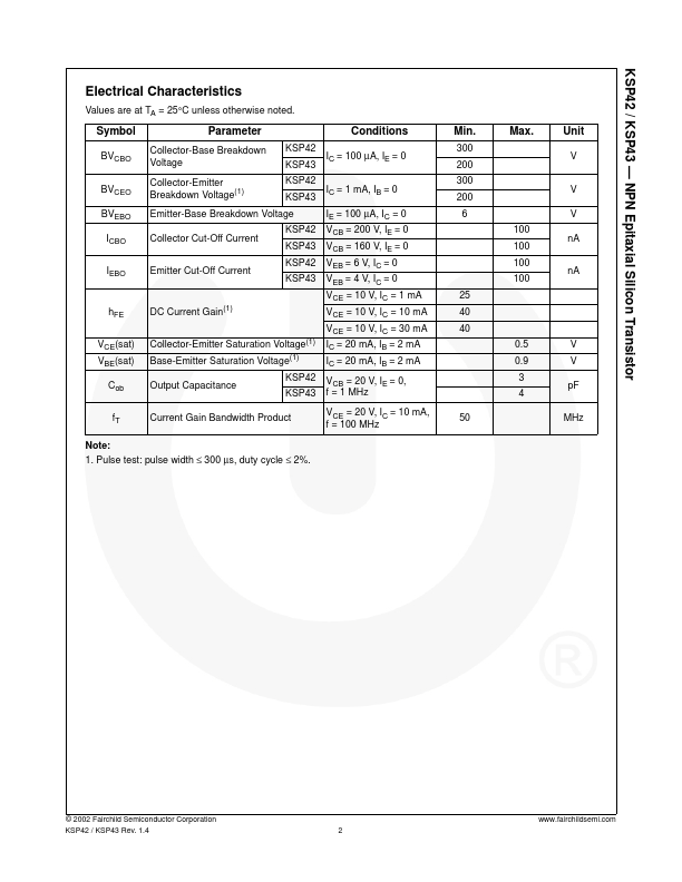 - Collector-Emitter Voltage: VCEO = KSP42: 300 V KSP43: 200 V