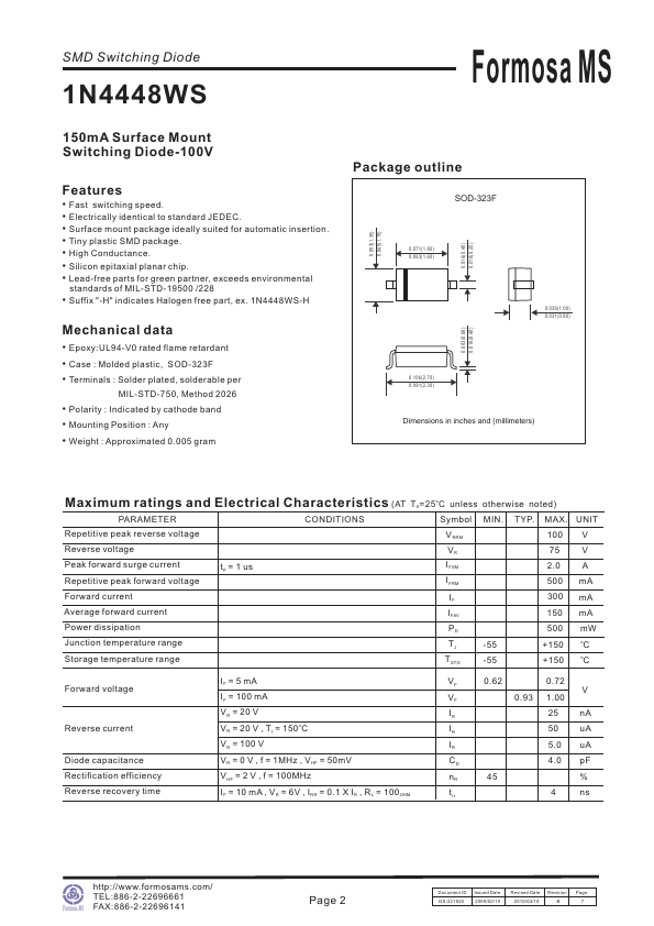 SMD Switching Diode 1N4448WS Formosa MS 150mA Surface Mount Switching Diode-100V.