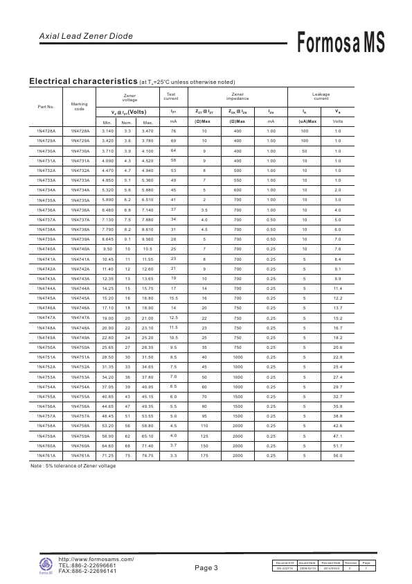 Axial Lead Zener Diode 1N4728A THRU 1N4761A Formosa MS 1000mW Axial Lead Zener Diodes - 3.3V-75V.